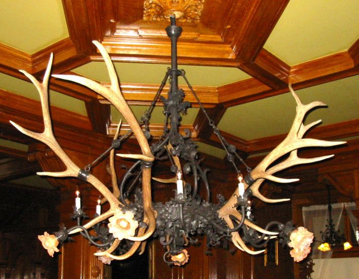 This is a reproduction of the original chandelier made by the famed Austrian-born master blacksmith, Cyril Colnik. This Flemish Renaissance mansion was completed in 1892, and it was fitted with many lighting fixtures that were both natural gas and electric, as electricity was rather new, and often unreliable. The mansion was purchased by the Catholic Archdiocese in 1908, and served as the residence of the archbishop. During the next 67 years, many elements of the mansion were removed and sold; one of which was the original foyer chandelier, purchased by what is now called “Von Trier”, a German style cocktail lounge. The mansion was purchased in 1975 with the intent to restore it to its original splendor, and open it to the public for tours. Even though I did not design this piece, I consider it to be my masterpiece, and one of the most challenging pieces I have created thus far in my career. (Lottermoser image)